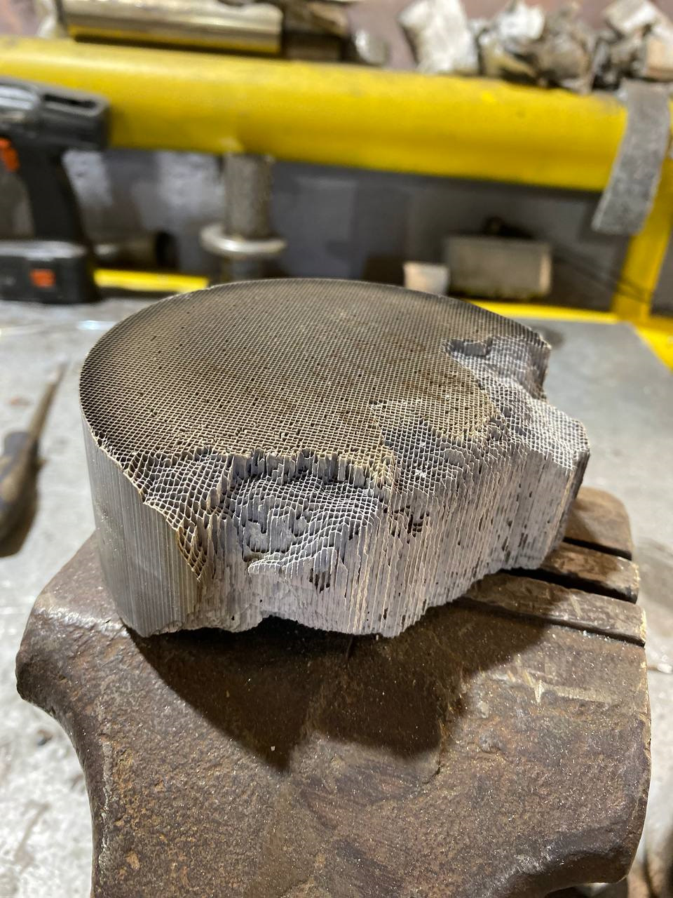 На фото: катализатор в разрезе, где видны его керамические соты — носители драгоценных металлов.