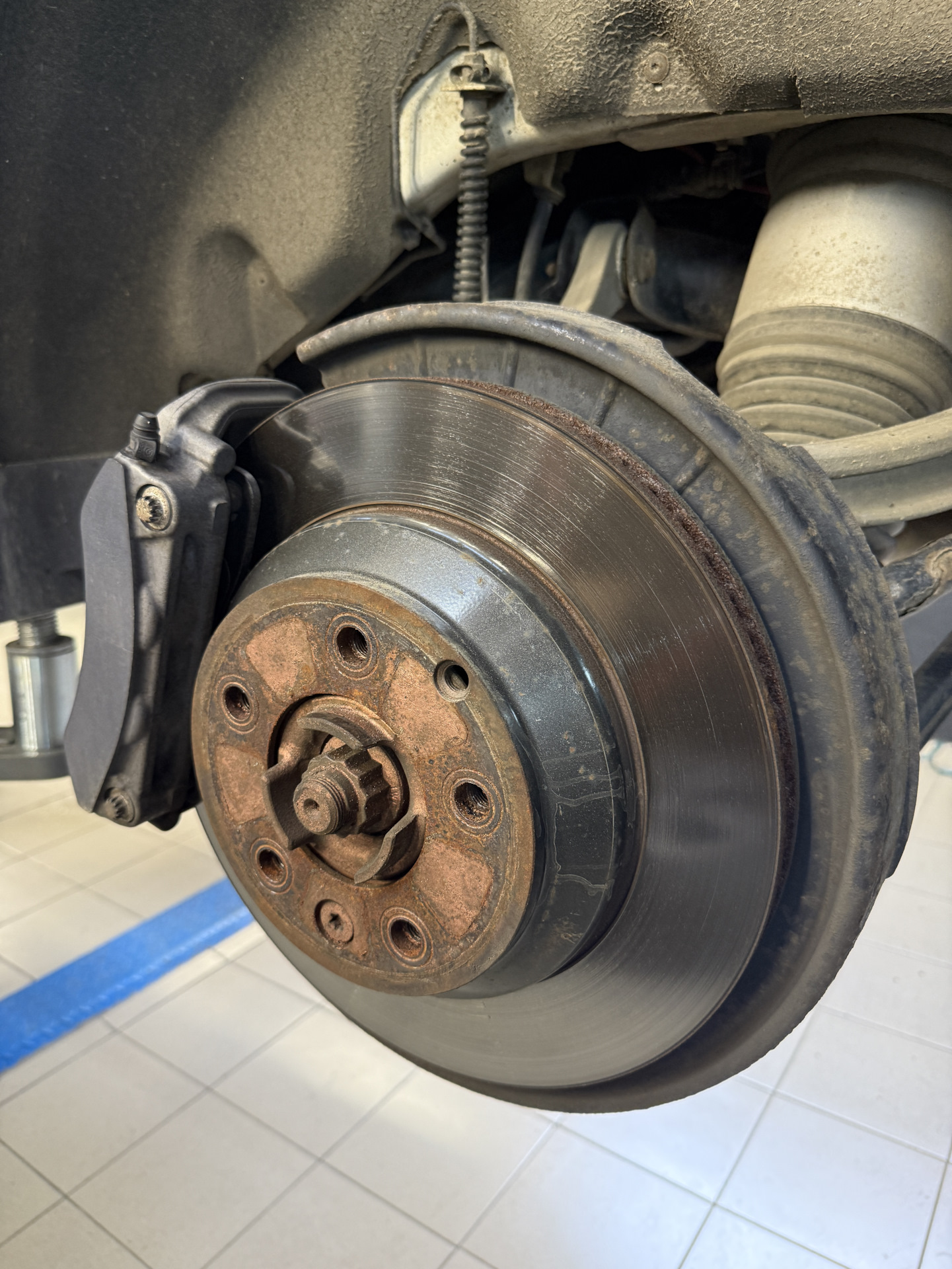 При детальной разборке узла выяснилось, что тормозные колодки близки к пределу износа, хотя датчики ещё не сработали. Для комплексного решения проблемы было решено снять диски и отправить их на проточку. Эта процедура позволяет устранить даже незначительную выработку и обеспечить идеальную поверхность для контакта с новыми колодками, избежав длительного периода притирки.