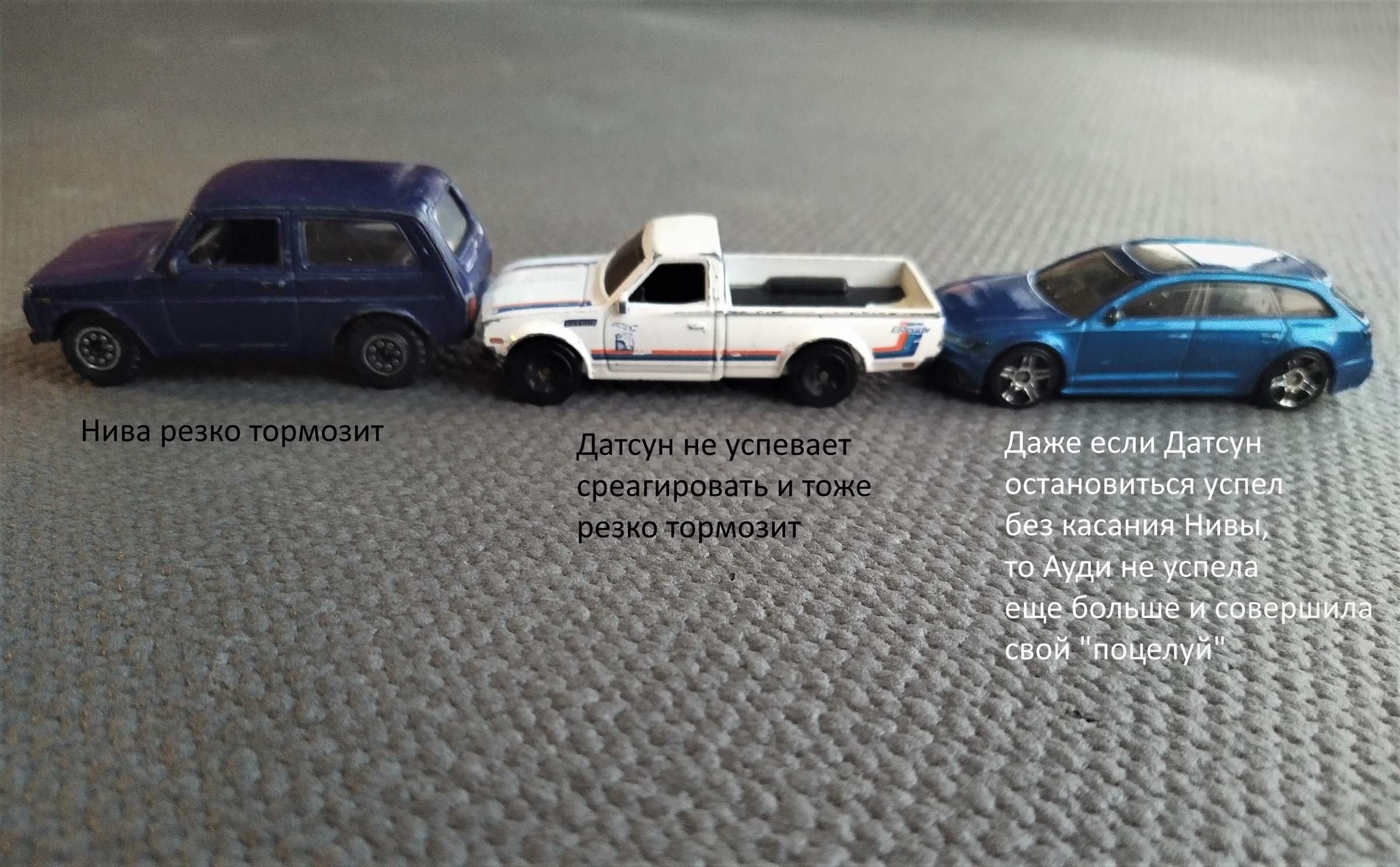 Тем временем водитель «Нивы» отвлекся, проехал чуть больше и быстрее, потому что начал тормозить позже, чем водитель впереди, а значит, трасса «Датсуна» была длиннее, а «Ауди» конечно тоже проехала достаточно долго. Когда машины впереди начали резко тормозить, мужчина за рулем Audi тоже затормозил, но было уже поздно.