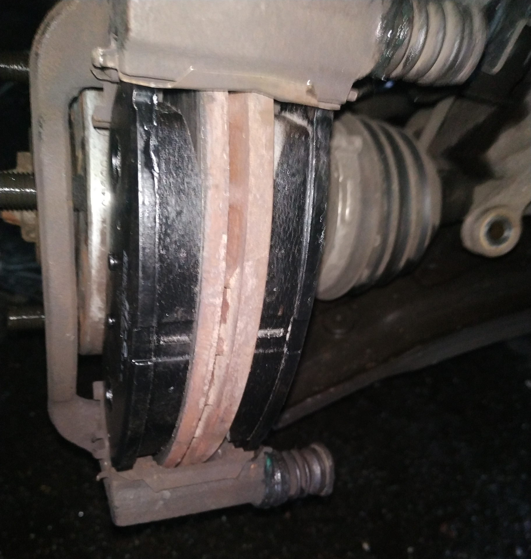 Обратите внимание: на внутренней колодке расположен механический индикатор износа (скоба). При сильном износе он начинает касаться диска, издавая характерный скрип. Его правильное положение показано на фото.